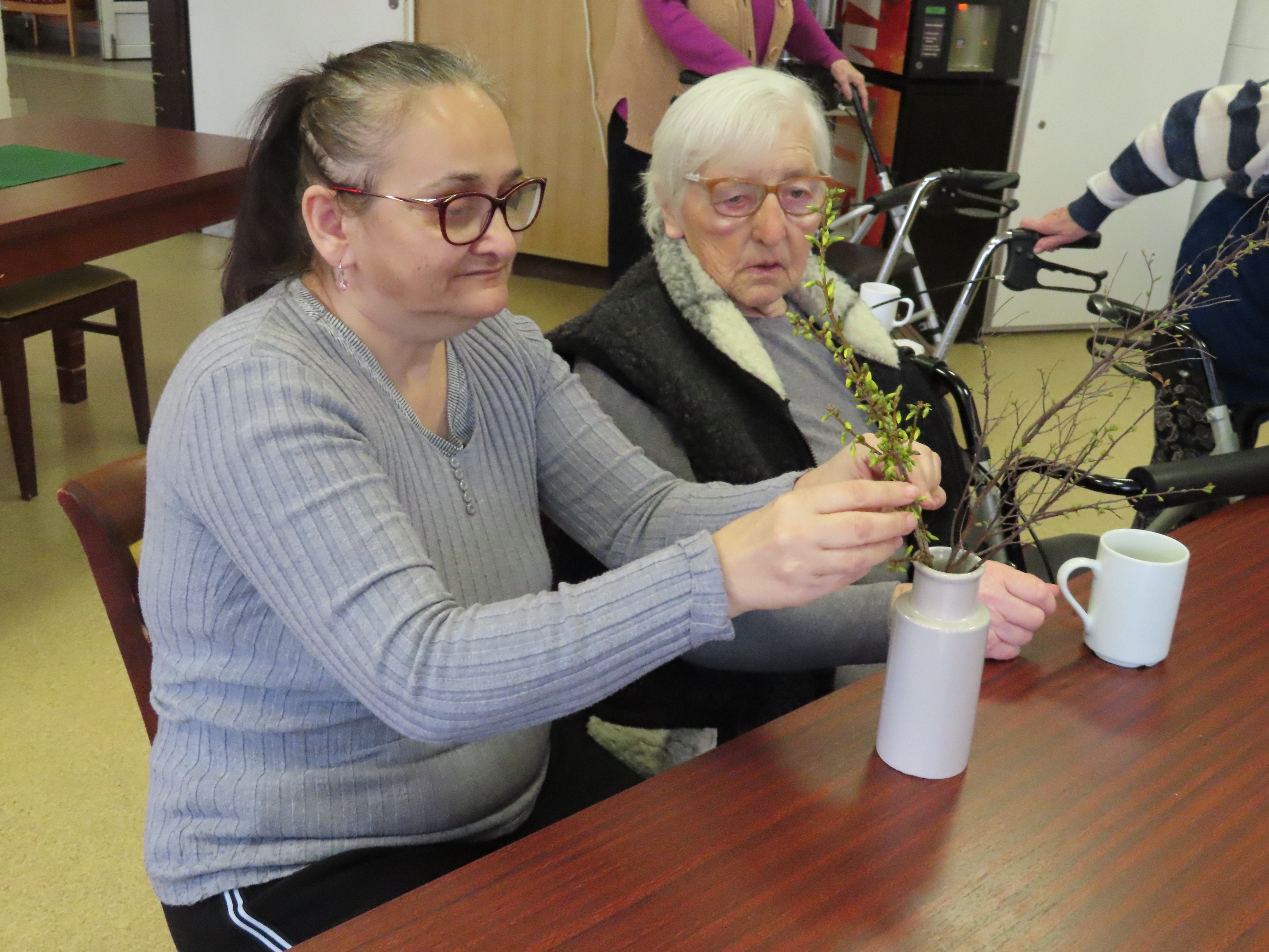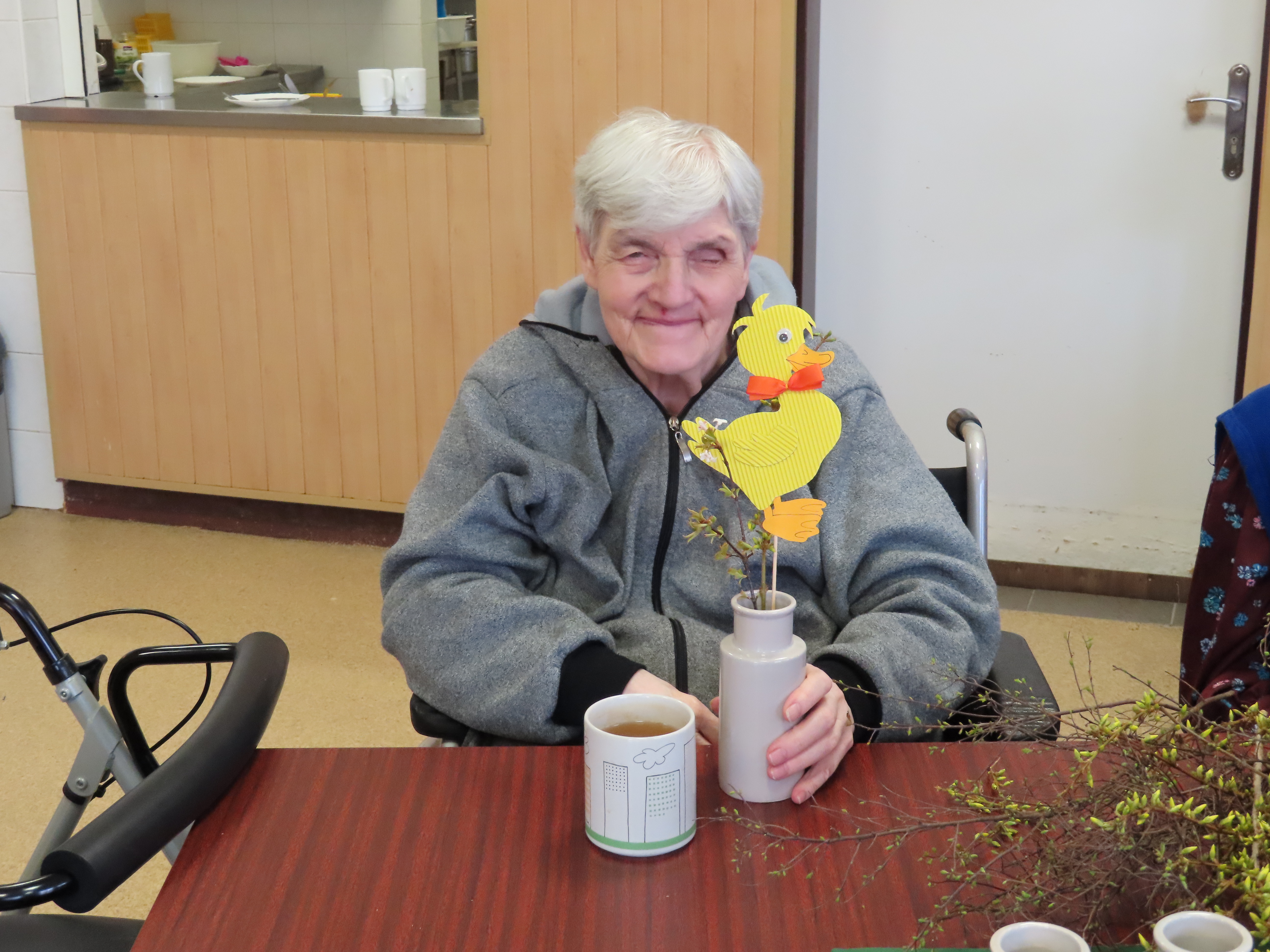 Na stole vázička a v ní jarní kytička.