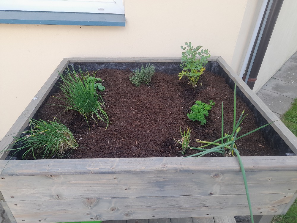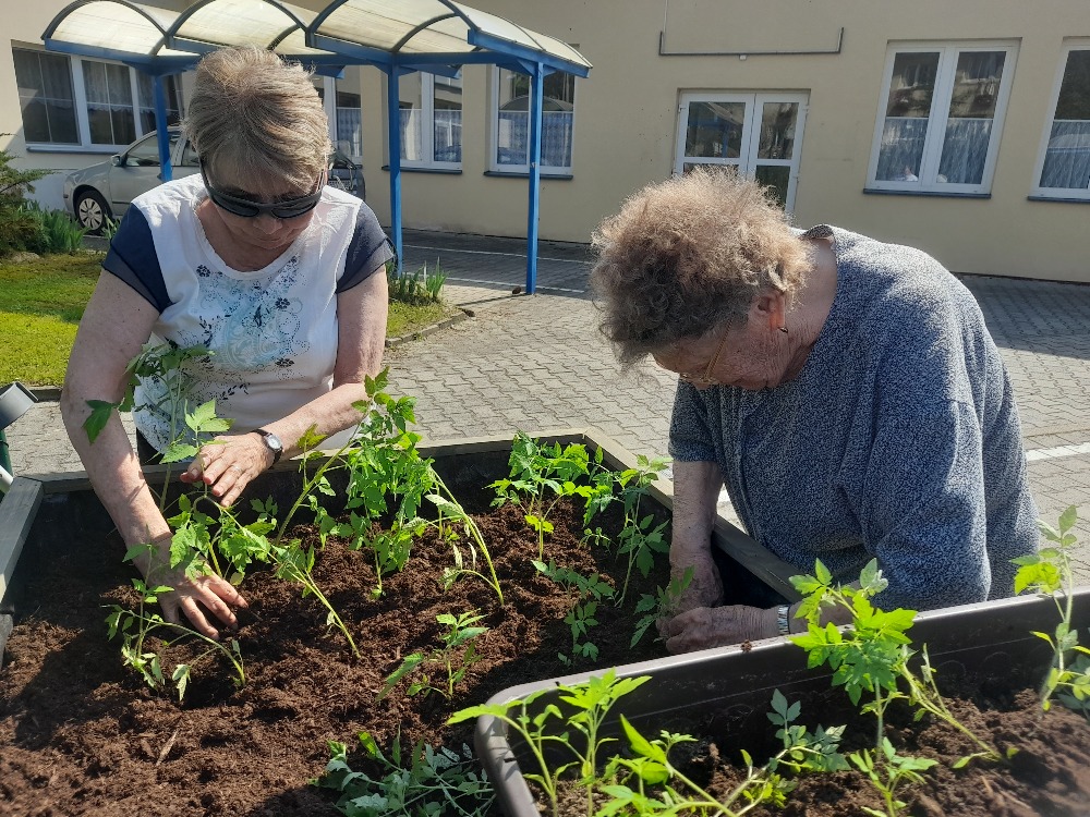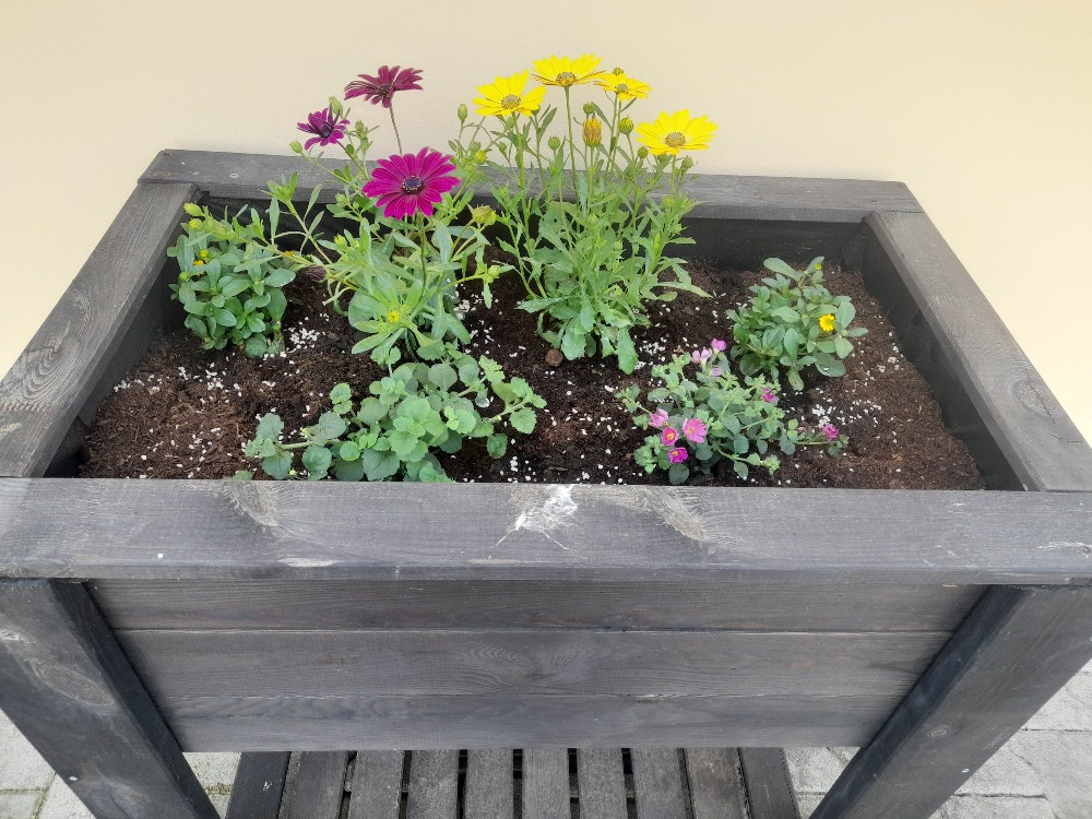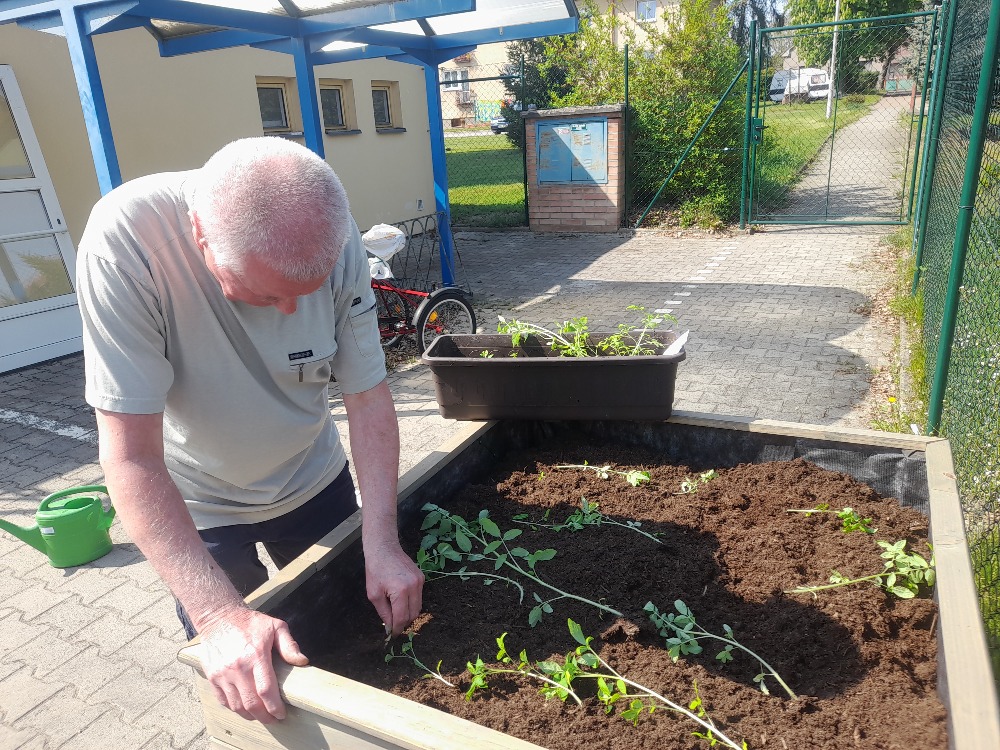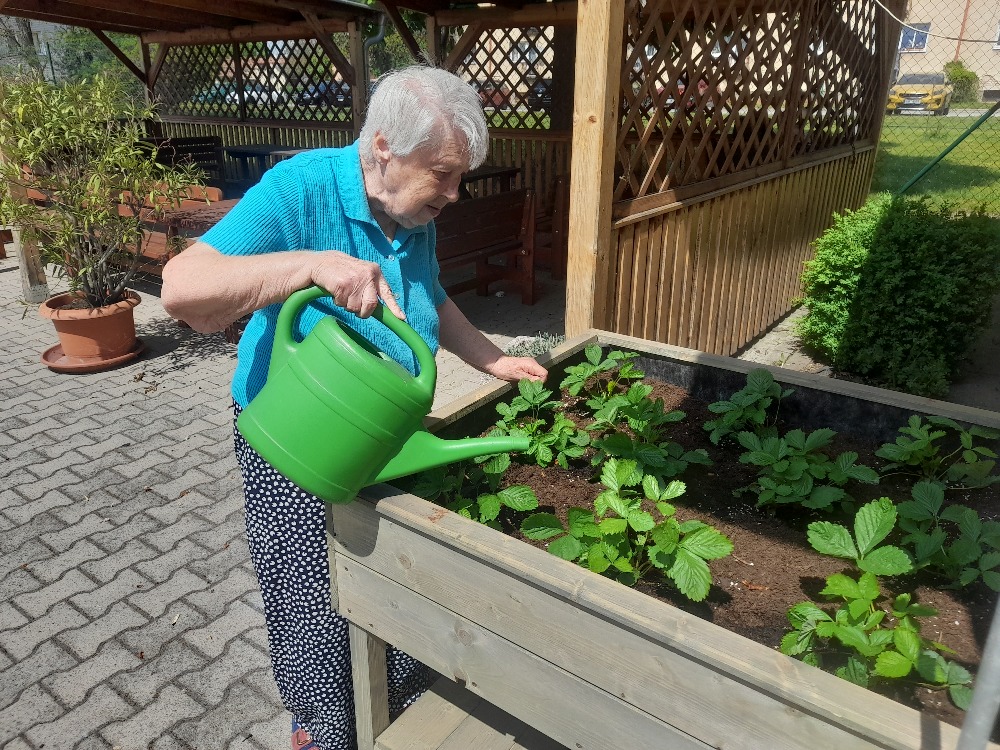 Vyvýšené záhony jsme zaplnili rajčaty, jahodami, květinami a bylinami.